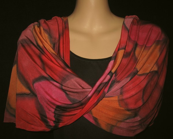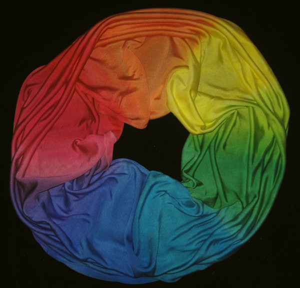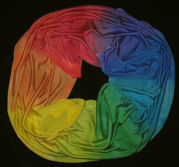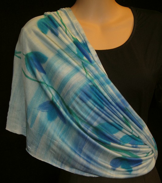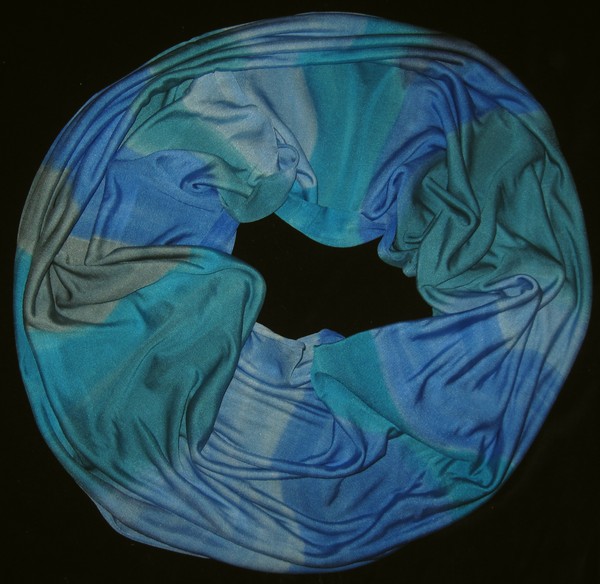 | Meine Jersey-Loops sind aus reinseidener Schlauchware, einem bi-elastischen Strickstoff ohne Naht. Ich schneide sie in Streifen und bemale sie auf einem Spezialrahmen. Seidenjersey hat einen besonderen Fall, ist sehr angenehm auf der Haut und bügelfrei! |