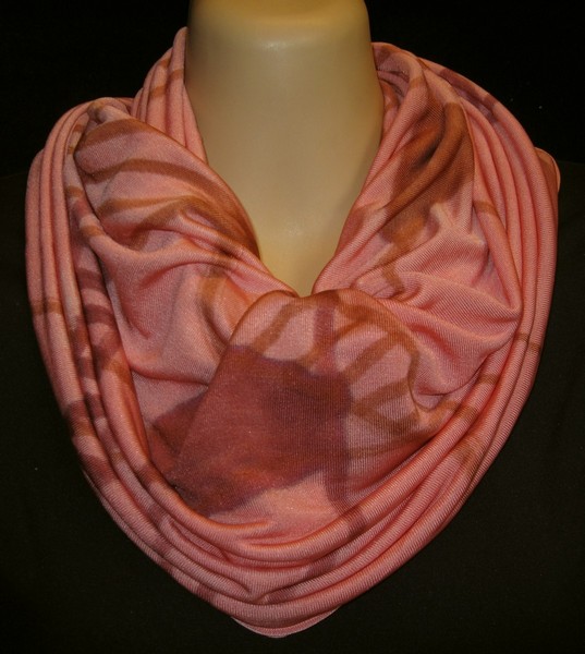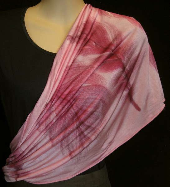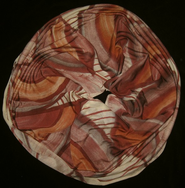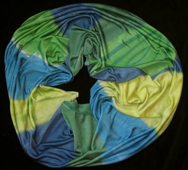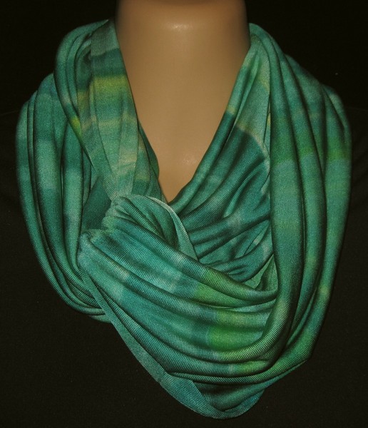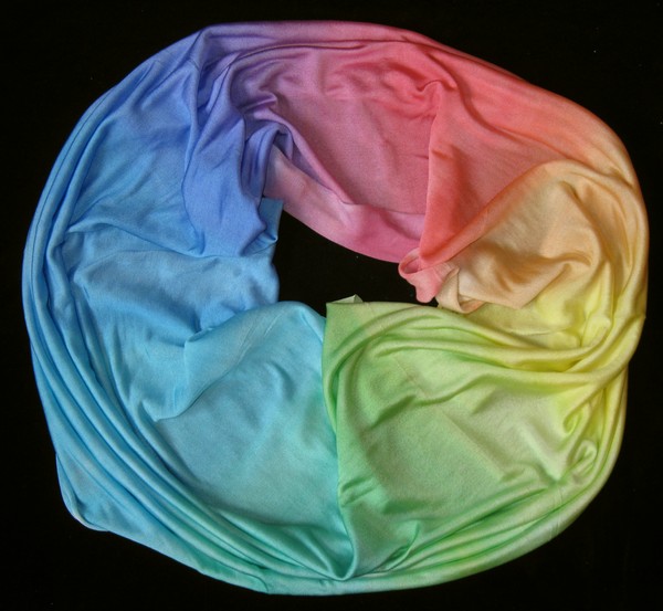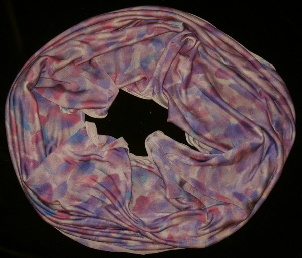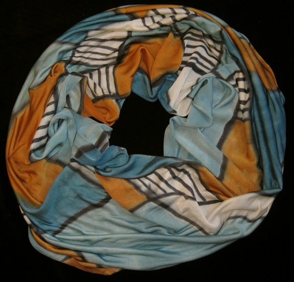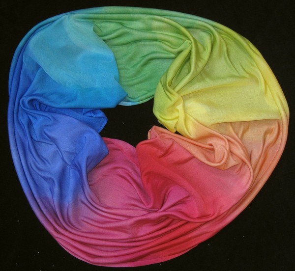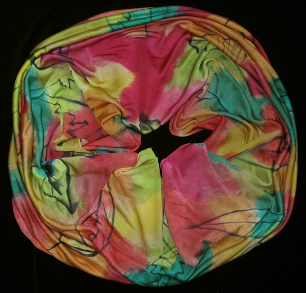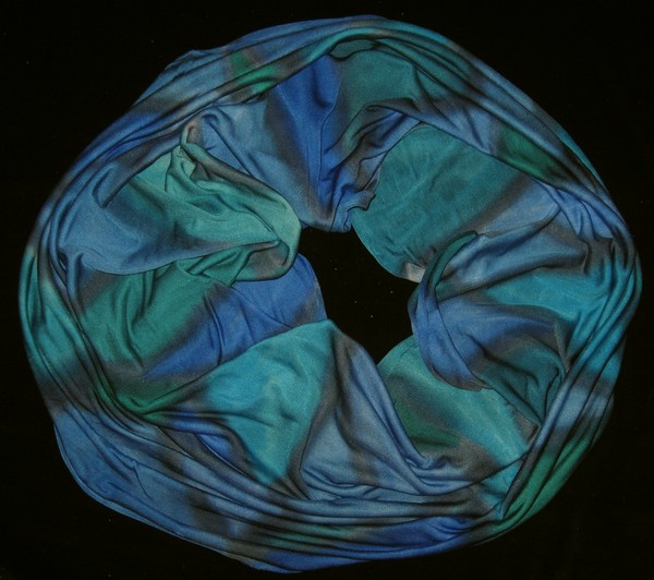 | Meine Jersey-Loops sind aus reinseidener Schlauchware, einem bi-elastischen Strickstoff ohne Naht. Ich schneide sie in Streifen und bemale sie auf einem Spezialrahmen. Seidenjersey hat einen besonderen Fall, ist sehr angenehm auf der Haut und bügelfrei! |