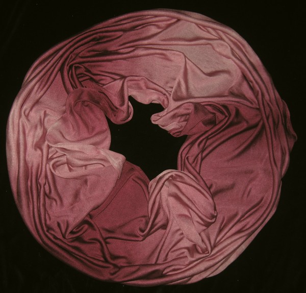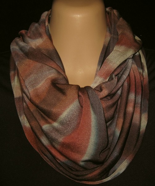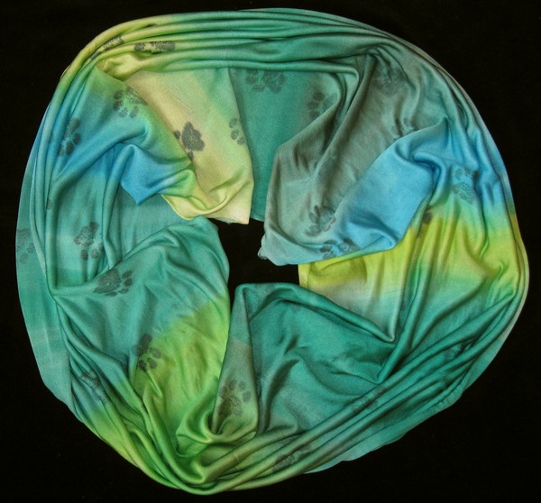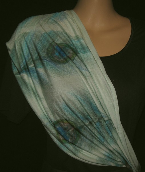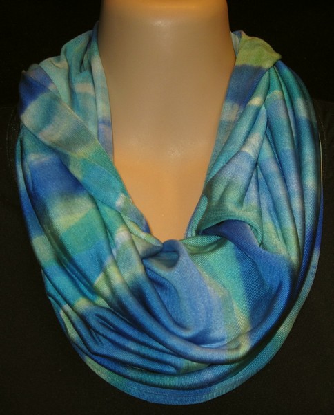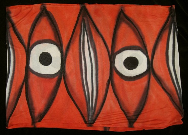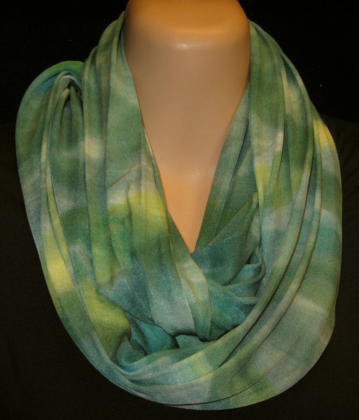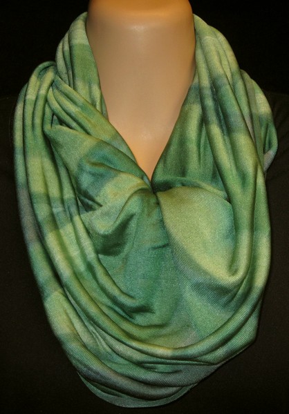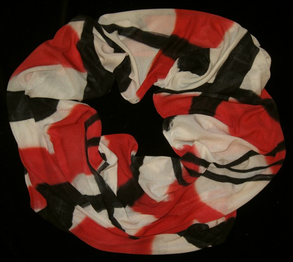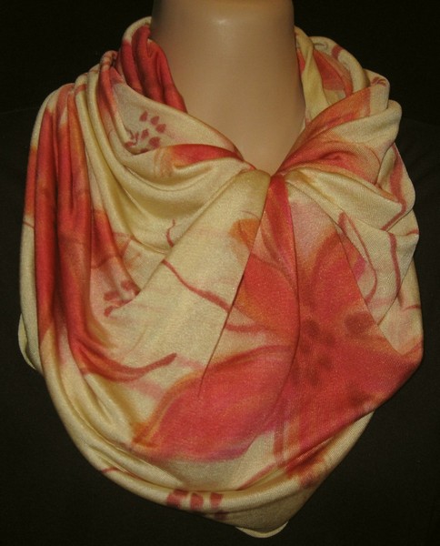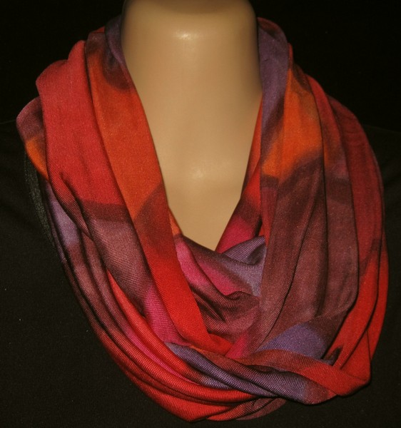 | Meine Jersey-Loops sind aus reinseidener Schlauchware, einem bi-elastischen Strickstoff ohne Naht. Ich schneide sie in Streifen und bemale sie auf einem Spezialrahmen. Seidenjersey hat einen besonderen Fall, ist sehr angenehm auf der Haut und bügelfrei! |